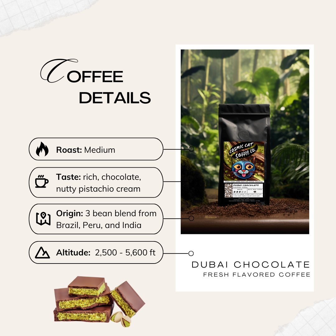 At Cosmic Cat Coffee, every bag of our Dubai Chocolate coffee is crafted for peak freshness and flavor — delivered right to your door.