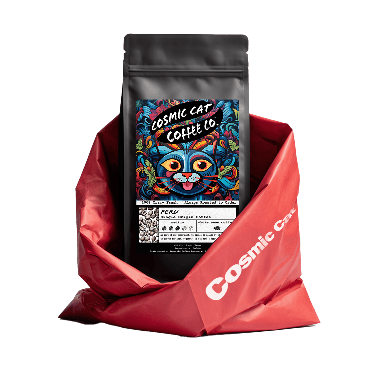 Embark on a journey to Piura and Amazonas with Cosmic Cat Coffee’s High Altitude Peruvian Coffee. Grown at elevations between 4,000 and 5,600 feet, these beans capture the heart of Peru’s rich coffee culture. Each cup, custom-roasted with care, narrates the story of Peruvian coffee tradition, delivering a complex and vibrant flavor profile. Freshly roasted daily and shipped the same day, your purchase also supports breakthrough cancer research initiatives.